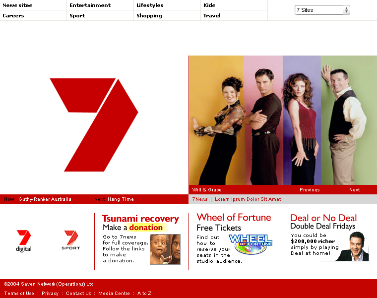 Not too much colour, though. Seven Network had abandoned its rainbow-tinted red-dominant 7 logo to more of a single-colour red logo, and more recently you're also starting to see a bit of "SE7EN" (when the word is used) on the website IRL. Mostly the network now uses only red and white on its sites...