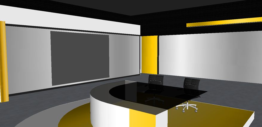 My first idea was to tone down the yellow and use more bright colours. Currently the black and yellow appears too dark and tacky, so while I've scaled down the yellow, I've made more use of silver and chrome type colours. I did base some of this set design on the recently rebranded 'VTM Nieuws' in Belgium.